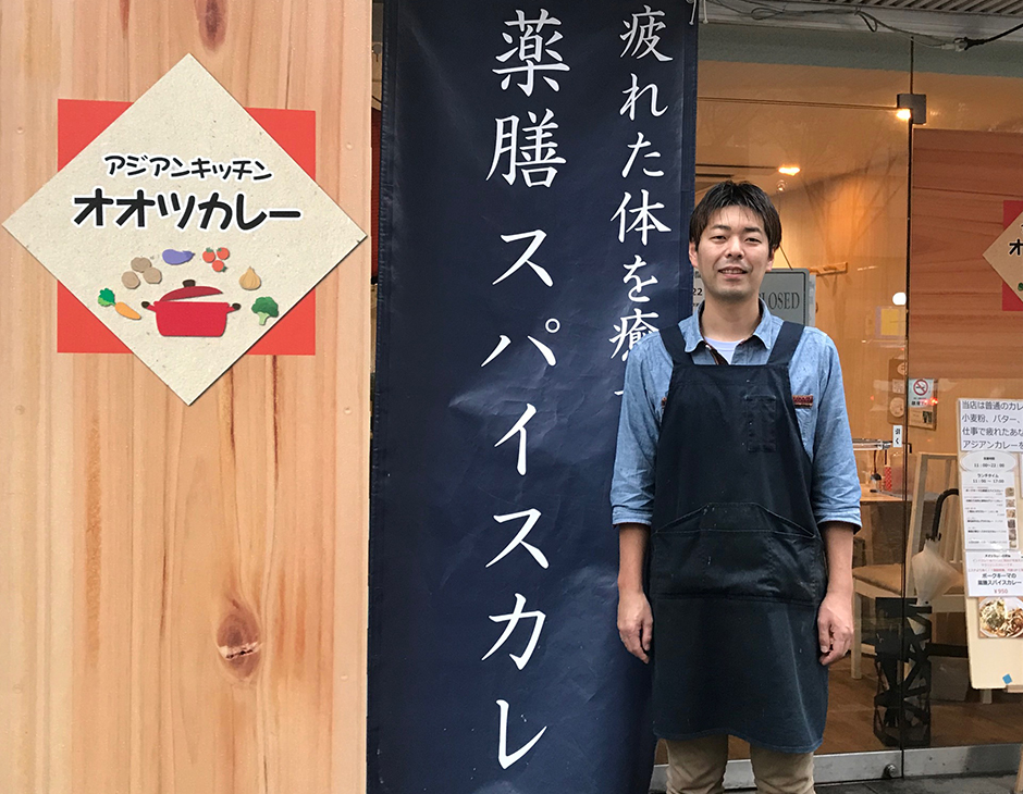 南森町駅から西へ徒歩5分。オフィスビルや飲食店が立ち並ぶ一角に、オオツカレーはあります。表に薬膳スパイスカレーの文字が目立つお店の中は、店主の大塚さんの人柄もあり、ゆったりとした空気が流れています。